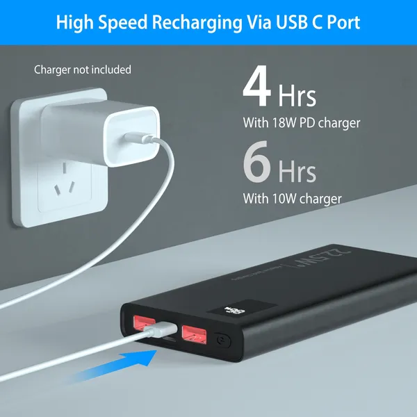 *3 Outputs & Fast Charging*:This power bank comes with 3 output ports; including 2x 22.5W output and 1 PD 18W two-way charging port; which intelligently allocate the exact voltage required to give your device the optimal and quickest charging speed. Share the charging ports with your family or friends conveniently. Besides; the power bank also supports fast charging via PD 18W port; greatly saving your time. *Digital Display*:Percentage-based readout shows you the precise remaining power and charging status. No need to guess whether itβs time to charge it or not. *Superior Safety*:The built-in smart circuits and high efficiency power management ensure protection against overcharging; short-circuit; over-current and high temperature; protecting your device automatically and extending service life of power bank. *Wide Compatibility*:Compatible with most private fast charge protocols. Fit for iPhone 13 11 Pro Max 12 Pro Max Mini Xs XS Max XR X 8 iPad Pro/Air 2/Mini; Samsung Galaxy S22 S21 S20 S10 S9 S8; and other electric devices that support fast charging(USB C Cable INCLUDED). *Portable*:The lightweight and compact design allows you to carry it anywhere you go. An ideal companion for airplane trip; shopping; travel and etc..