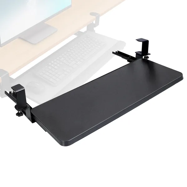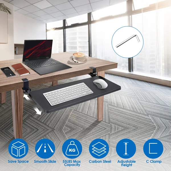 *Save Space Keyboard Tray*:Our under desk keyboard tray provides an extra storage surface and is spacious enough to hold keyboard,mouse and other office accessories. Effectively help you to save desktop place and make your desk look cleaner and well organized. *Adjustable Height*:Capable to be adjusted up to 2.16in,you can freely modify our keyboard tray according to various deskβs thickness. Besides,you can also rotate the rotary clamp to diverse angles,meaning that our keyboard tray can be used for different types of desks. *Smooth Slide Track*:Different from other fixed tray,our keyboard tray is equipped with smooth slide track,you can effortlessly pull it out or slide it in under the desk when not in use. Retractable length can extends up to 8.85in,perfect assistant for optimizing your workspace. *Up to 55LBS Capacity*:Excellent load capacity ability,ensure you safe and stable usage experience. No need to worry about shaking. You can rest assure to put heavy keyboard,mouse or even laptop on it. *Premium Carbon Steel Material*:Made of premium carbon steel material,high-strength,high-hardness and wear-resistance. Designed with considerate sponge pads,prevent your desk from scratches.
