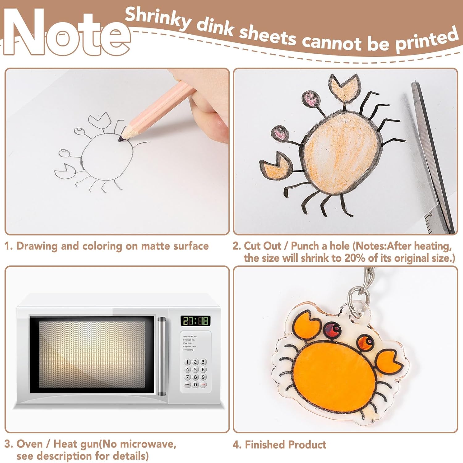 Easy to use - Simply draw or trace a design onto shrink film, decorate with colored pencils or permanent mediums, cut out the design and bake. Designs will shrink to 20% of its original size and thicken to a durable plastic. This shrink plastic is not suitable for inkjet or laser printing