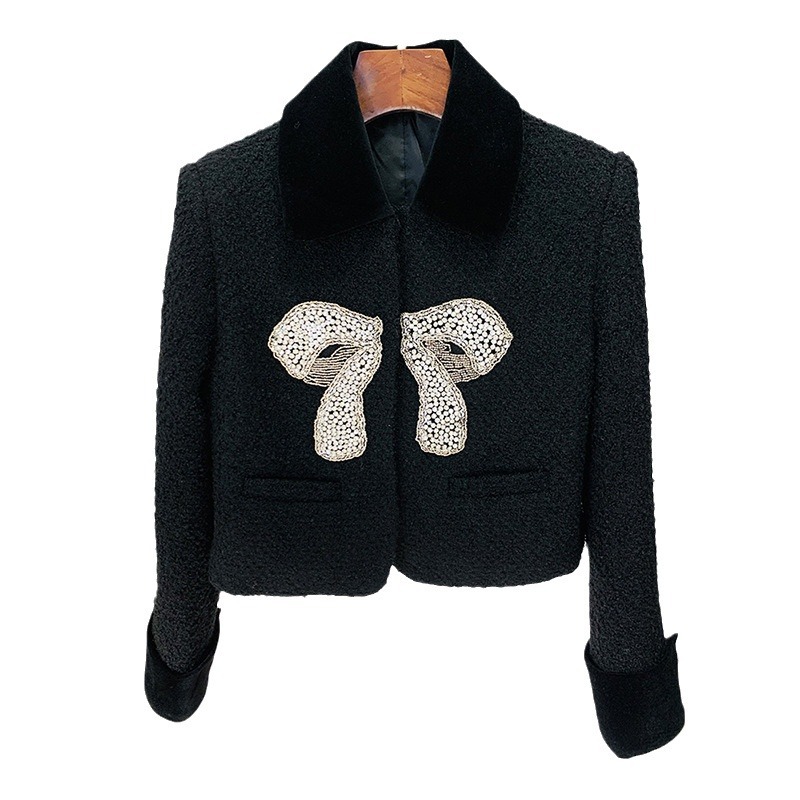 Autumn And Winter New Bow Beaded Jacket Coat Black XL
