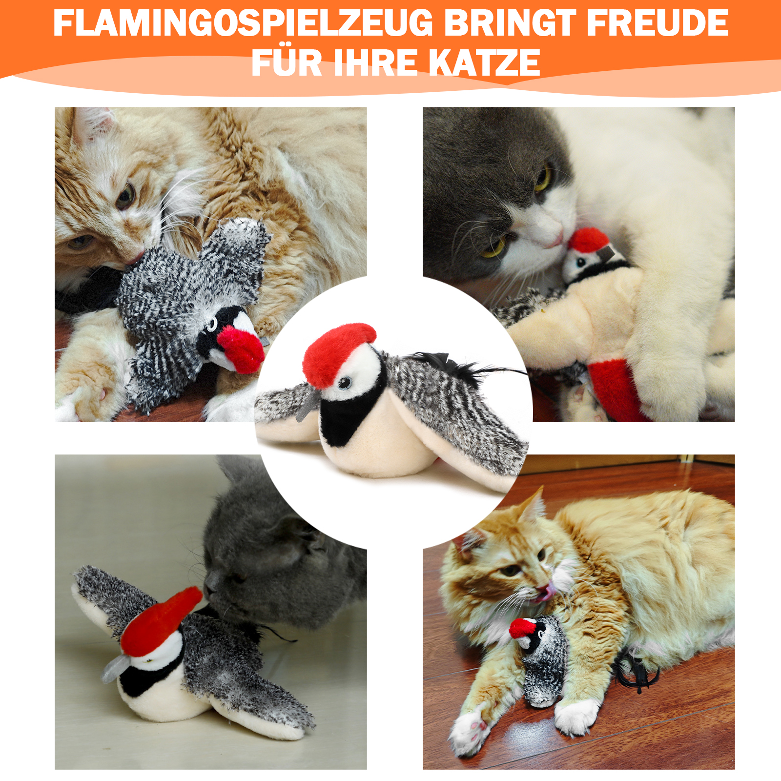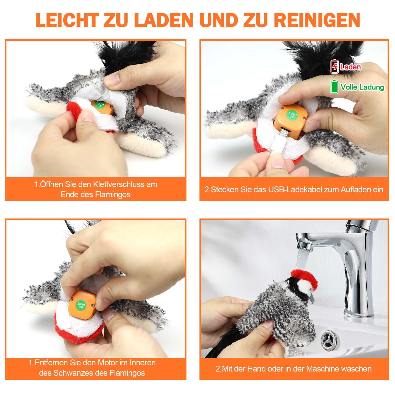 This interactive cat toy features a built-in touch sensor. When your cat taps it, the flamingo automatically flaps its wings and chirps, attracting your cat to bite, chase, and grab it. When no longer touched, the toy stops after a short period to save power, and reactivates instantly when your cat interacts with it again.