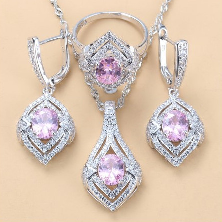 Gem-inlaid Pendant Earrings Necklace Ring Ladies Three-piece Set Pink No.10