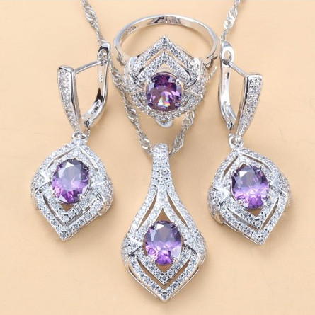 Gem-inlaid Pendant Earrings Necklace Ring Ladies Three-piece Set Purple No.10