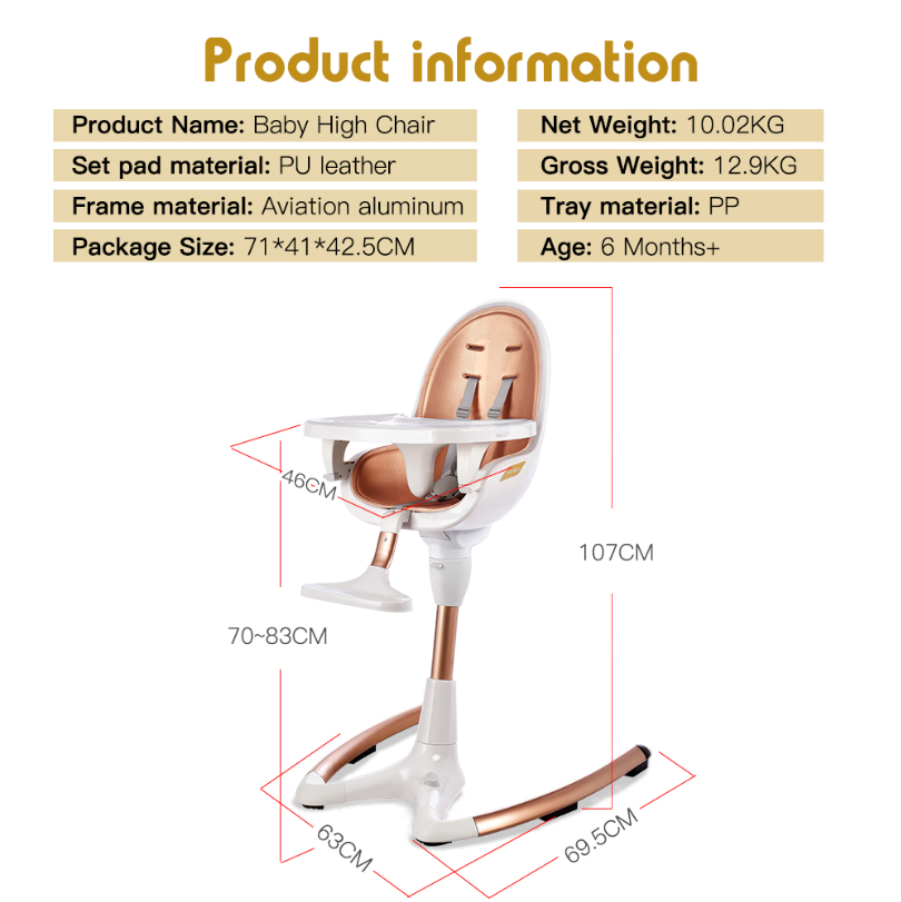 Introducing the High-end High Chair – where modern design meets everyday convenience. Designed with a unique egg-shaped seat to support your baby’s natural posture, this high chair includes a soft PU cushion for comfort during mealtime. Unlike traditional fabric cushions, the PU cover is easy to wipe clean and adds a sleek look. Safety is a priority with the 5-point harness, while the one-touch lever on the back lets you adjust the seat between 110° and 135°. The sturdy base features a foot-pedal for smooth height adjustment. To simplify cleanup, the removable tray has a push-button width adjustment and can be rinsed easily. Suitable for various body types, it supports healthy sitting habits from infancy. All materials are water and stain resistant, and the high chair meets the latest European and U.S. safety standards.
