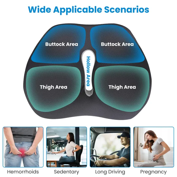 *Ergonomic & Supportive*:Filled with high density memory foam,this pain relief cushion pillow fits your buttock contour and evenly distributes your body weight,providing relief from sciatica pain and discomfort whether you're seated at your desk or cruising down the highway. *Non-slip Bottom*:This chair seat cushion features a non-slip polyester base,keeping itself in place and preventing sliding. *Machine Washable Cover*:This memory foam seat cushion’s cover is removable and machine washable for effortless cleaning and maintenance. *Breathable Design*:There is a hollow design in the middle of the chair seat cushion,making it more breathable when sitting. *Ideal Gift*:Our seat cushion improve discomfort from sedentary,long driving,hemorrhoids,post surgery,pregnancy etc.. Can be taken and used anywhere,fit for any type of chair,such as wheelchair,office chair,airplane seat,car seat,gaming chair,dining chair etc..An ideal gift for family,lovers,colleagues and friends!