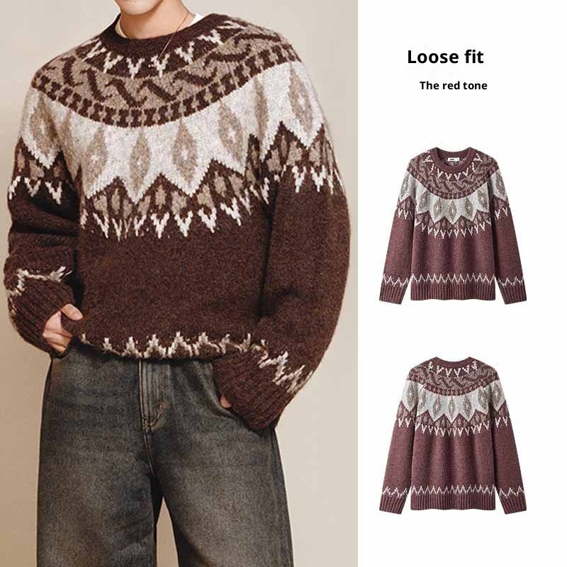 Men's Round Neck Jacquard Christmas Knitted Sweater Brown 3XL