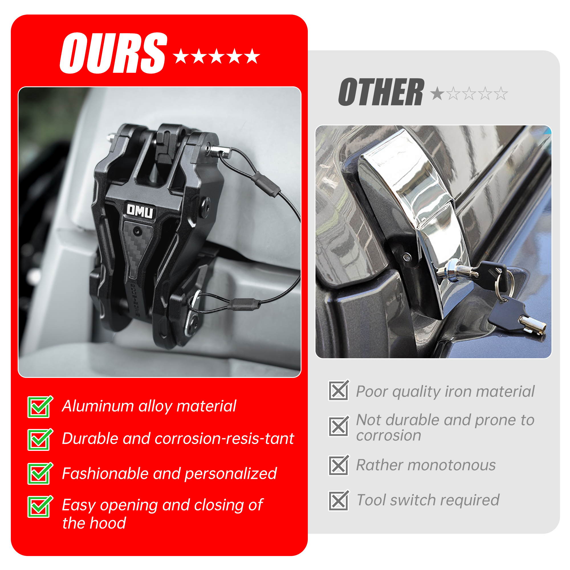Show Off Personalized Aesthetics:The uniquely designed bonnet latch satisfies the desire of Jeep enthusiasts to personalize their Jeeps, making the appearance of the car a cooler and sportier style, more fashionable.
