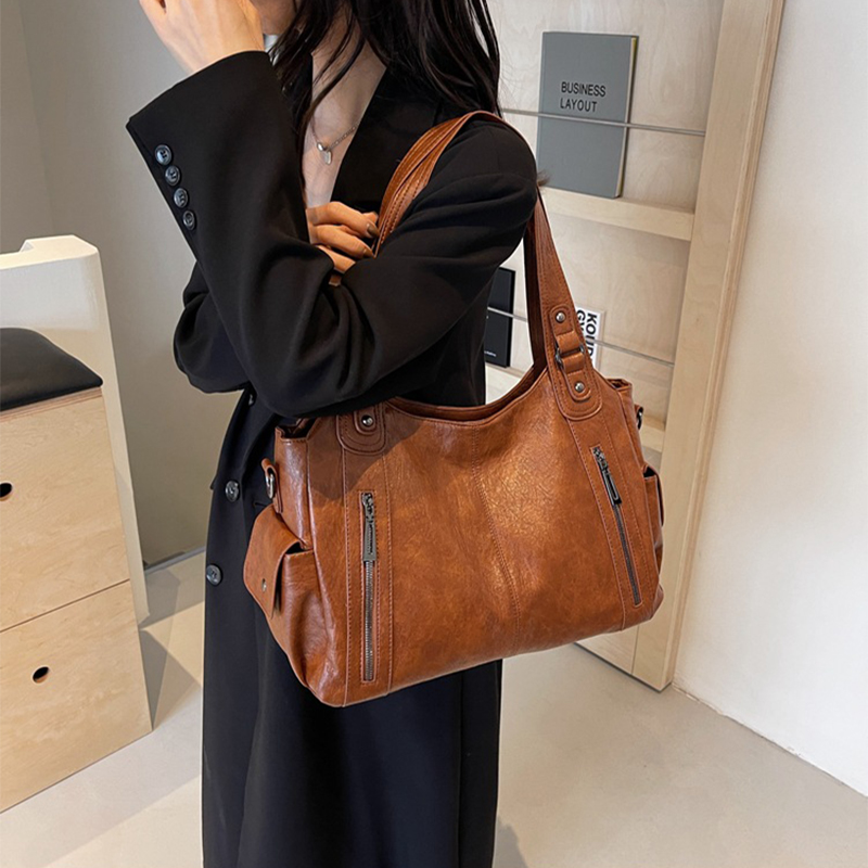 Retro Large Capacity Shoulder Bags Autumn And Winter Zipper Crossbody Bag For Women Handbags Coffee
