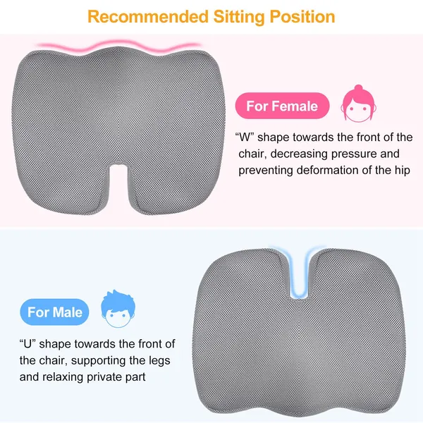 **STRONG COCCYX SUPPORTIVE PERFORMANCE*:Made from premium high-density memory foam materials and adopting ergonomic U-shaped cut out design,featuring long lasting use and never out of shape,to snugly fit and provide an optimal support for your coccyx and tailbone. **EFFECTIVE SCIATICA & TAILBONE PAIIN ALLEVIATION*:Can assist in most sitting pain caused by sciatica,herniated discs,tailbone injuries,pregnancy,hip pain and hemorrhoids and meantime promote a health posture. **BREATHABLE & WASHABLE MESH COVER*:Coming with a breathable mesh cover to accelerate air circulation and keep you cool and comfortable all day. And the zipper design allows you to wash the cover separately after removing it from the memory foam cushion. **WIDE APPLICATION*:Its 17.32in long,13.76in wide and 2.76in thick exterior dimension allows it to be used on any office chair,computer chair,armchair,wheelchair,car seat etc. **GREAT GIFT*:Our reliable memory foam seat cushion is designed to help with relieve pain and is a great gift for people who have long sitting time and driving time and who suffer from sciatica,herniated discs,tailbone injuries,hip pain and hemorrhoids.