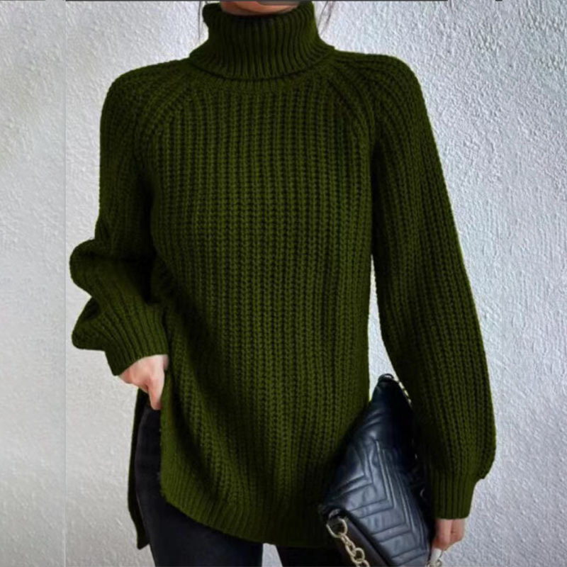 Turtleneck Pullover Sweater With Split Design Fashion Simple Solid Color Long Sleeve Tops Women's Clothing Sea Blue XL